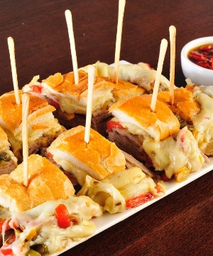 Para o molho, refogue na manteiga a outra cebola e os pimentões em tiras com uma pitada de cúrcuma e sal. Fatie o pernil e derreta o queijo provolone em uma chapa ou frigideira. Abra o o pão francês e acrescente o molho de cebola e pimentão e a carne fatiada. Sirva quente.